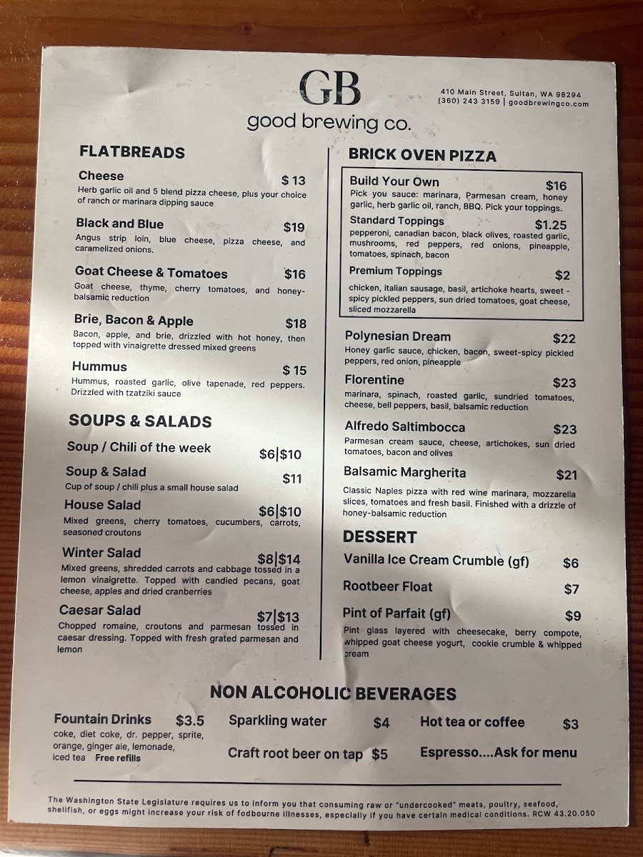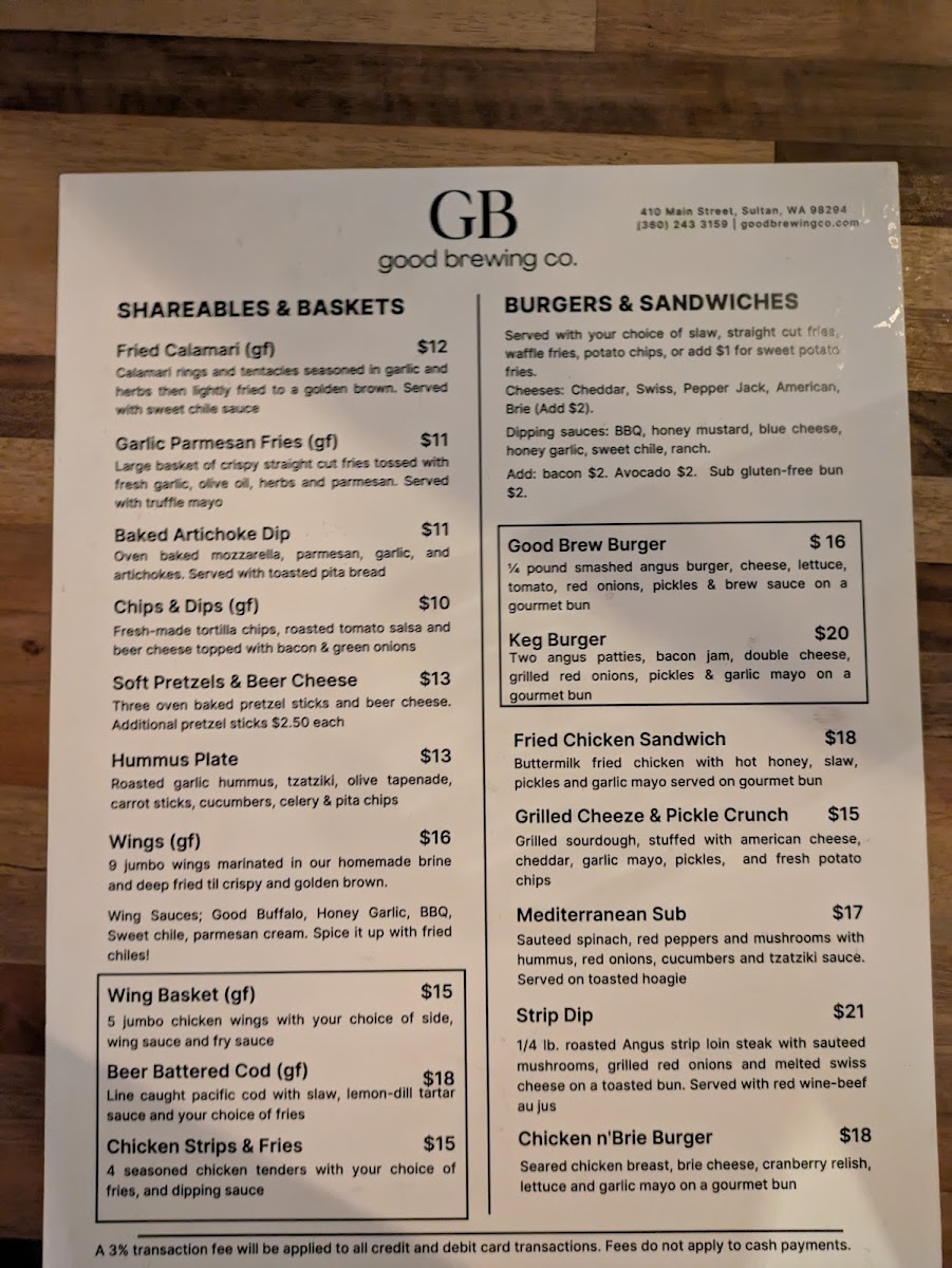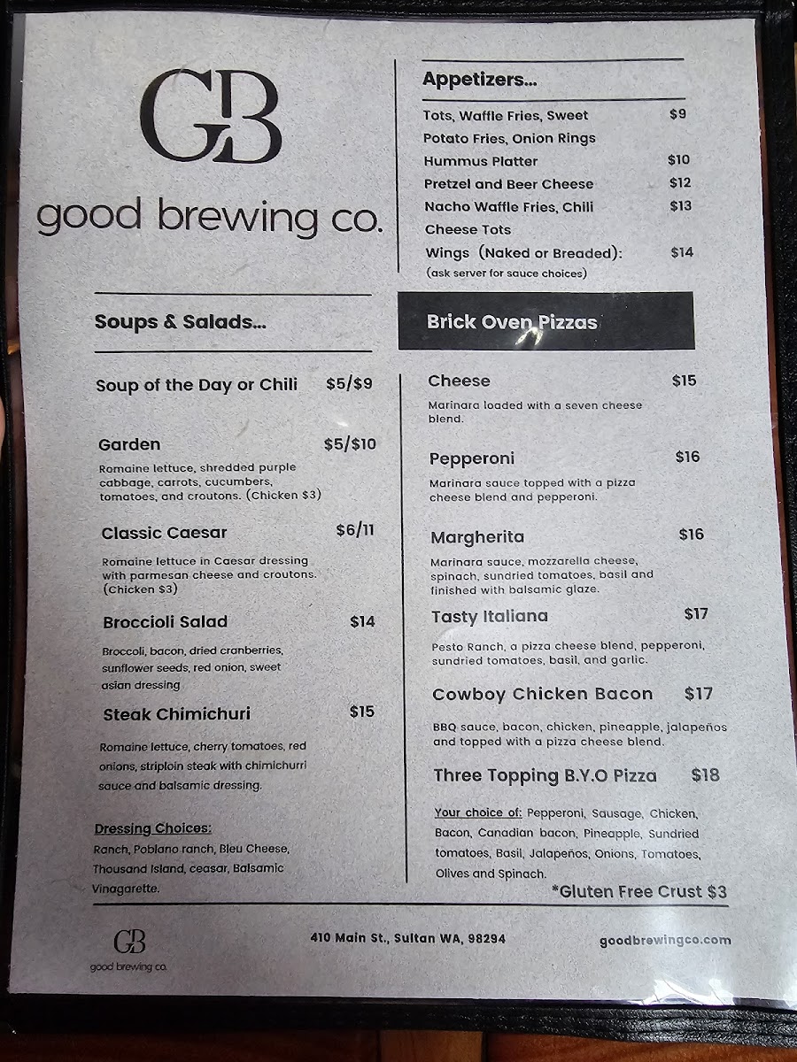 Good Brewing Sultan offers a menu that strikes a balance between casual pub favorites and thoughtfully crafted bites. The atmosphere here invites guests to enjoy comforting, approachable food whether they’re settling in for a relaxed afternoon or winding down after a day outdoors.